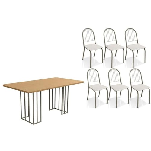 Sala de Jantar Completa Duina c/ Tampo de Madeira 160cm e 6 Cadeiras Noruega Niquel/Freijo - Courano Branco - Kappesberg