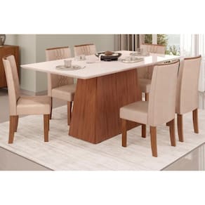 Sala de Jantar Completa Dulce Tampo Madeirado c/ Vidro Reto 180x90cm e 6 Cadeiras Zoe Freijo/Off White - Suede Creme - DJ Móveis - Blush