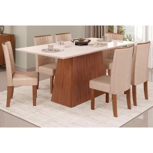 Sala de Jantar Completa Dulce Tampo Madeirado c/ Vidro Reto 180x90cm e 6 Cadeiras Zoe Freijo/Off White - Suede Creme - DJ Móveis