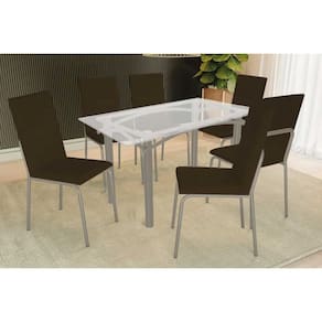 Sala de Jantar Completa Elba c/ Tampo de Vidro 150cm e 6 Cadeiras Amsterdã Niquel - Courano Marrom - Kappesberg