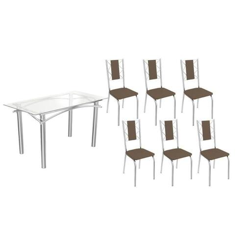 Sala De Jantar Completa Elba C/ Tampo De Vidro 150cm E 6 Cadeiras Lisboa Cromada - Courano Marrom - Kappesberg