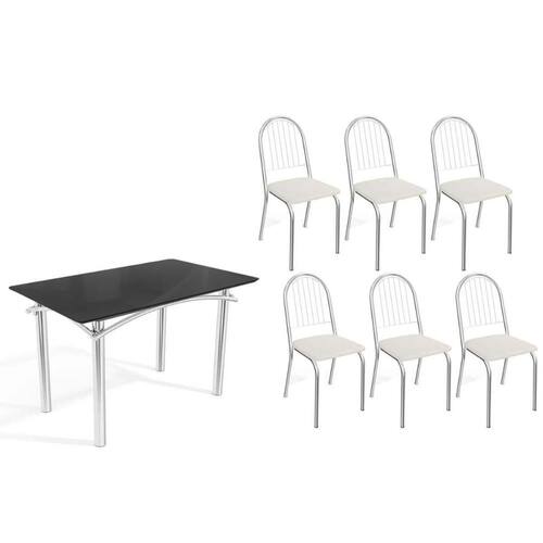 Sala de Jantar Completa Elba Tampo Madeirado c/ Vidro 120cm e 6 Cadeiras Noruega Cromada/Preto - Courano Branco - Kappesberg