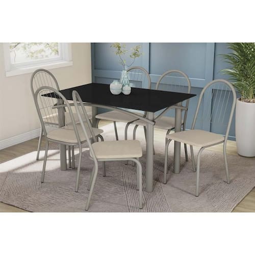 Sala de Jantar Completa Elba Tampo Madeirado c/ Vidro 120cm e 6 Cadeiras Noruega Niquel/Preto - Courano Bege - Kappesberg