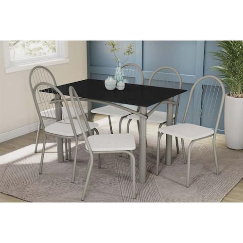 Sala de Jantar Completa Elba Tampo Madeirado c/ Vidro 120cm e 6 Cadeiras Noruega Niquel/Preto - Courano Branco - Kappesberg Abaixo segue os produtos do KIT: Sala de Jantar Completa Elba Tampo Madeirado c/ Vidro 120cm e 6 Cadeiras Noruega Niquel/Preto - Courano Branco - Kappesberg