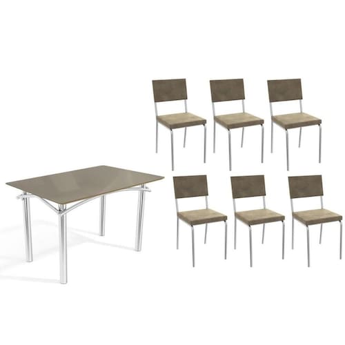 Sala de Jantar Completa Elba Tampo Madeirado c/ Vidro 120cm e 6 Cadeiras Zaria Cromada/Freijo Bronze - Suede Bege - Kappesberg Abaixo segue os produtos do KIT: Sala de Jantar Completa Elba Tampo Madeirado c/ Vidro 120cm e 6 Cadeiras Zaria Cromada/Freijo Bronze - Suede Bege - Kappesberg