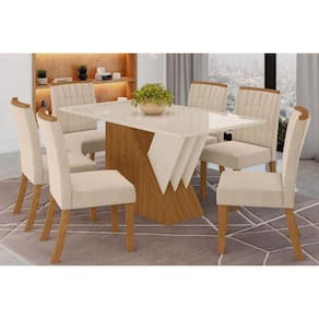 Sala de Jantar Completa Épic SC24 Tampo Madeirado c/ Vidro Canto Curvo 160x90cm e 6 Cadeiras Tauá Nature/Linho - Henn