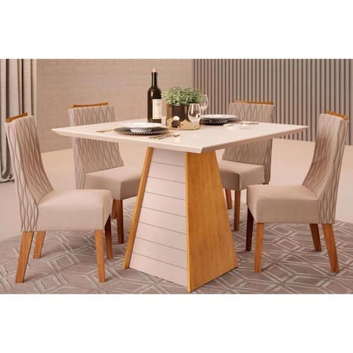 Sala de Jantar Completa Fler Tampo Madeirado c/ Vidro 90x90cm e 4 Cadeiras Jade Cedro/Off White - Suede Kraft - DJ Móveis