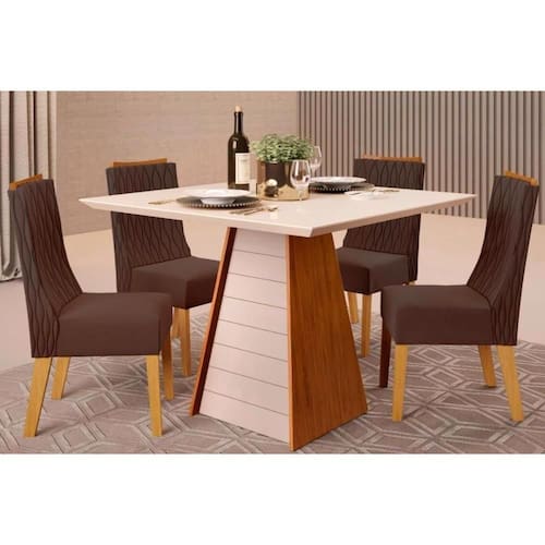 Sala De Jantar Completa Fler Tampo Madeirado C/ Vidro 90x90cm E 4 Cadeiras Jade Freijo/off White - Suede Moca - Dj Móveis