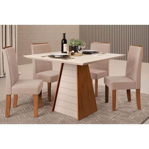 Sala de Jantar Completa Fler Tampo Madeirado c/ Vidro 90x90cm e 4 Cadeiras Zoe Freijo/Off White - Suede Creme - DJ Móveis
