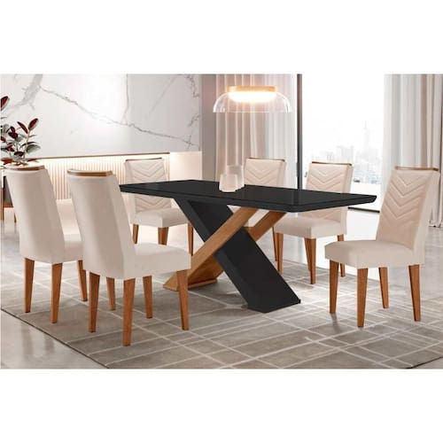 Abaixo segue os produtos do KIT: Sala de Jantar Completa Imperatriz Tampo Madeirado c/ Vidro Canto Curvo 180x90 e 6 Cadeiras Londrina Imbuia/Grafite - Suede Creme - Rufato