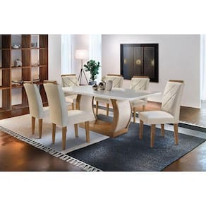 Sala de Jantar Completa Jade c/ Tampo Madeirado c/ Vidro Canto Curvo 180cm + 6 Cadeiras Melissa Imbuia/Veludo Creme - Rufato Abaixo segue os produtos do KIT: Sala de Jantar Completa Jade c/ Tampo Madeirado c/ Vidro Canto Curvo 180cm + 6 Cadeiras Melissa Imbuia/Veludo Creme - Rufato
