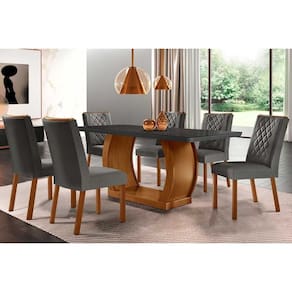 Sala de Jantar Completa Jade c/Tampo Madeirado Vidro Canto Curvo 180x90cm e 6 Cadeiras Jade Imbuia/Grafite - Linho Grafite - Rufato