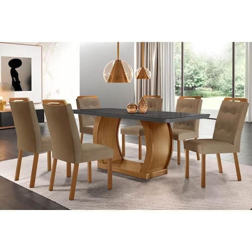 Abaixo segue os produtos do KIT: Sala de Jantar Completa Jade Tampo Madeirado c/ Vidro Canto Curvo 180x90 e 6 Cadeiras Imperatriz Imbuia/Grafite - Suede Capuccino - Rufato