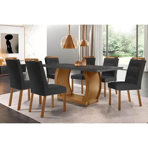 Abaixo segue os produtos do KIT: Sala de Jantar Completa Jade Tampo Madeirado c/ Vidro Canto Curvo 180x90 e 6 Cadeiras Imperatriz Imbuia/Grafite - Suede Grafite - Rufato