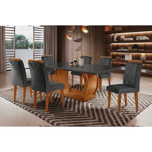 Sala de Jantar Completa Jade Tampo Madeirado c/ Vidro Curvo 180x90 e 6 Cadeiras Amsterdã Imbuia/Veludo Grafite - Rufato