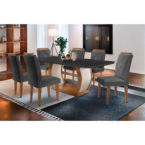 Abaixo segue os produtos do KIT: Sala de Jantar Completa Jade Tampo Madeirado c/ Vidro Curvo 180x90 e 6 Cadeiras Melissa Imbuia - Veludo Grafite - Rufato