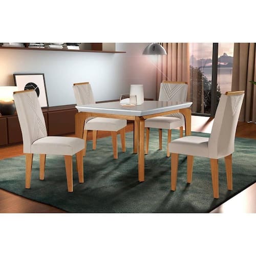 Sala de Jantar Completa Londrina c/ Tampo Madeirado Vidro Canto Curvo 120x80cm e 4 cadeiras Amsterdã Imbuia/Off White - Suede Creme - Rufato