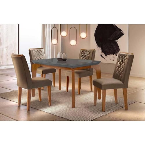 Sala de Jantar Completa Londrina c/ Tampo Madeirado Vidro Canto Reto 120x80cm e 4 cadeiras Jade Imbuia/Grafite - Veludo Capuccino - Rufato