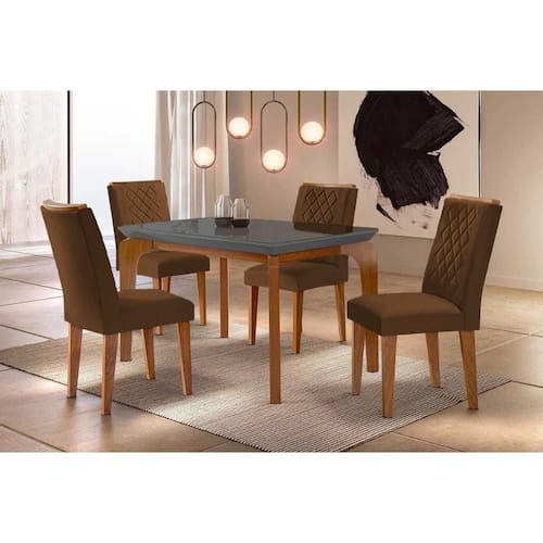 Sala de Jantar Completa Londrina c/ Tampo Madeirado Vidro Canto Reto 120x80cm e 4 cadeiras Jade Imbuia/Grafite - Veludo Marrom - Rufato