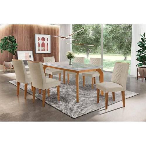 Sala de Jantar Completa Londrina Tampo Madeirado c/ Vidro 180x90cm e 6 Cadeiras Jade Imbuia/Bege Turim - Rufato - Blush