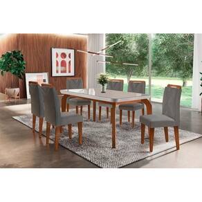 Sala de Jantar Completa Londrina Tampo Madeirado c/ Vidro Curvo 180x90 e 6 Cadeiras Amsterdã Capuccino/Suede Grafite - Rufato