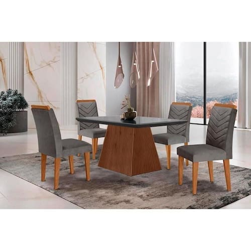 Sala de Jantar Completa Luna c/ Tampo Madeirado c/ Vidro Canto Curvo 120x80cm e 4 cadeiras Londrina Imbuia/Grafite - Suede Grafite - Rufato