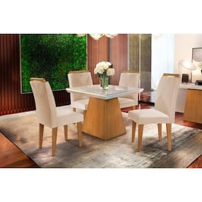 Sala de Jantar Completa Luna c/ Tampo Madeirado Vidro Canto Curvo 90x90cm e 4 cadeiras Amsterdã Imbuia/Off White - Suede Creme - Rufato
