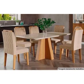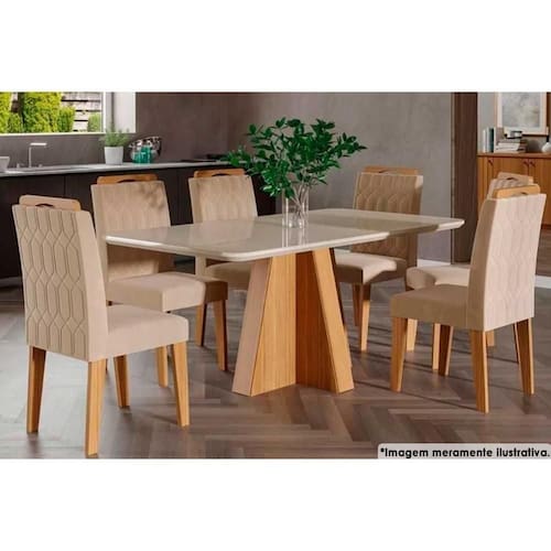 Sala de Jantar Completa Maite c/ Tampo Madeirado c/ Vidro Canto Curvo 160X80cm e 6 Cadeiras Paola Nature-Madeirado/Suede Nude - Cimol