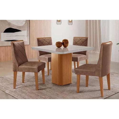 Sala de Jantar Completa Maldivas c/ Tampo Madeirado c/ Vidro Canto Curvo 90x90cm e 4 Cadeiras Pietá Naturale/Off White - Corano Capuccino - Rufato Abaixo segue os produtos do KIT: Sala de Jantar Completa Maldivas c/ Tampo Madeirado c/ Vidro Canto Curvo 90x90cm e 4 Cadeiras Pietá Naturale/Off White - Corano Capuccino - Rufato