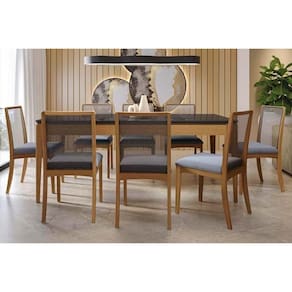 Abaixo segue os produtos do KIT: Sala de Jantar Completa Mira Tampo Madeirado c/ Vidro 100x200cm e 8 Cadeiras Lara Carvalho/Preto fosco/Vidro preto - Linho Cinza - Kappesberg