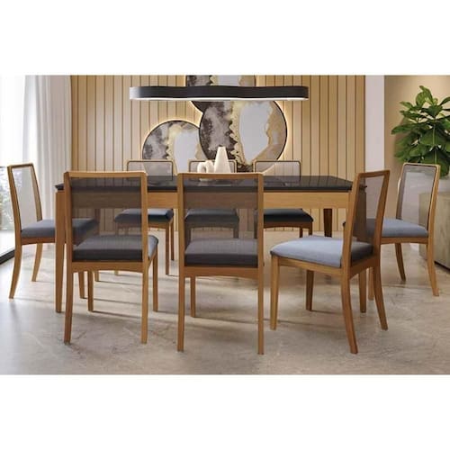 Sala de Jantar Completa Mira Tampo Madeirado c/ Vidro 100x200cm e 8 Cadeiras Lara Carvalho/Preto fosco/Vidro preto - Linho Cinza - Kappesberg