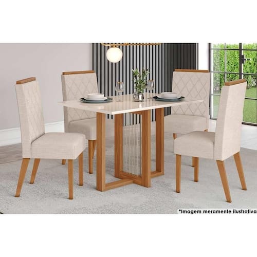 Sala de Jantar Completa Natalí c/ Tampo Madeirado c/ Vidro Reto 120x80cm e 4 Cadeiras Nina Nature/Veludo Light Linho - Henn