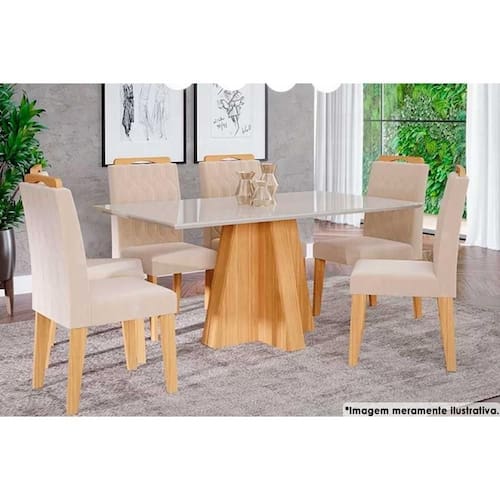 Sala de Jantar Completa Patricia c/ Tampo Madeirado c/ Vidro Canto Reto 160x80cm e 6 Cadeiras Paola Nature-Madeirado/Suede Nude - Cimol Abaixo segue os produtos do KIT: Sala de Jantar Completa Patricia c/ Tampo Madeirado c/ Vidro Canto Reto 160x80cm e 6 Cadeiras Paola Nature-Madeirado/Suede Nude - Cimol