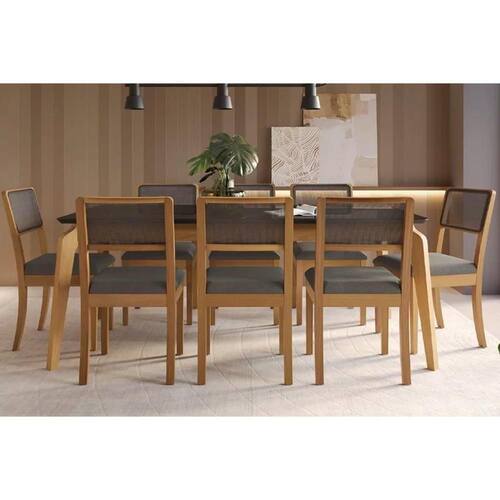 Sala De Jantar Completa Petra Tampo Madeirado C/ Vidro 100x200cm E 8 Cadeiras Lola Carvalho/preto Fosco/vidro Preto - Linho Cinza - Kappesberg
