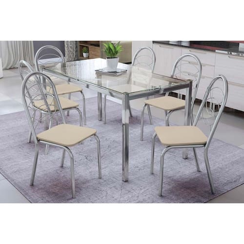 Sala de Jantar Completa Reno c/ Tampo Vidro 150x80cm e 6 Cadeiras Holanda Cromada - Assento Nude 16 - Kappesberg Abaixo segue os produtos do KIT: Sala de Jantar Completa Reno c/ Tampo Vidro 150x80cm e 6 Cadeiras Holanda Cromada - Assento Nude 16 - Kappesberg