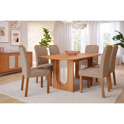 Sala de Jantar Completa Valentina Tampo Madeirado 180x90cm e 6 Cadeiras Paola Cinamomo - Carvalho/Linho Bege - Cimol