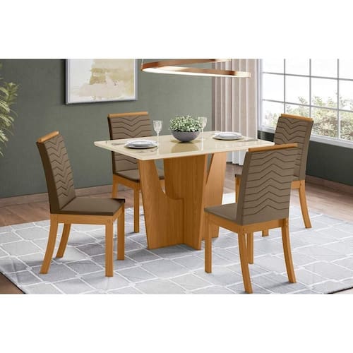 Sala de Jantar Completa Vértice Tampo Madeirado c/ Vidro Canto Reto 120x80cm e 4 Cadeiras Isa Nature/Suede Light Bege - Henn