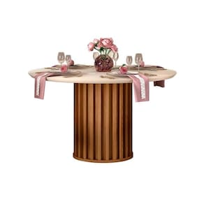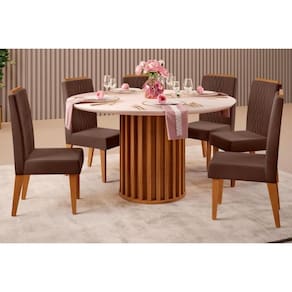 Abaixo segue os produtos do KIT: Sala de Jantar Completa Viena Tampo Madeirado c/ Vidro 136cm e 6 Cadeiras Lia Freijo/Off White - Suede Moca - DJ Móveis