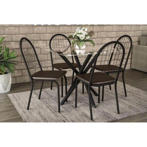Sala de Jantar Completa Volga c/ Tampo Vidro 95cm + 4 Cadeiras Noruega Preto Fosco/Courano Marrom - Kappesberg