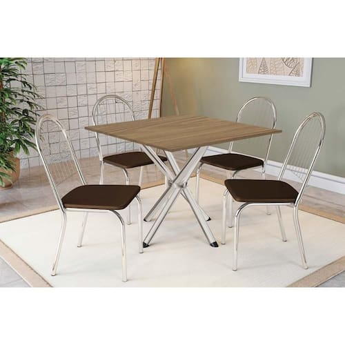 Sala de Jantar Completa Volga c/ Tampo de Madeira 90cm e 4 Cadeiras Noruega Cromado/Nogueira - Marrom - Kappesberg