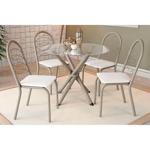 Sala de Jantar Completa Volga c/ Tampo de Vidro 95cm e 4 Cadeiras Holanda Niquel - Branco - Kappesberg