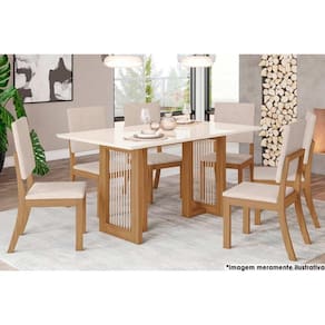 Sala de Jantar Completa Yara c/ Tampo Madeirado c/ Vidro Reto 160x90cm e 6 Cadeiras Milla Nature/Veludo Light Linho - Henn