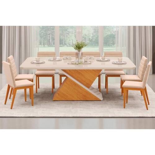 Sala De Jantar Completa Zafira Tampo Madeirado C/ Vidro Curvo 200x100cm E 8 Cadeiras Sofia Cedro/off White - Ipe/suede Creme - Dj Móveis