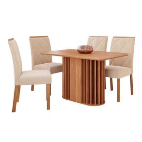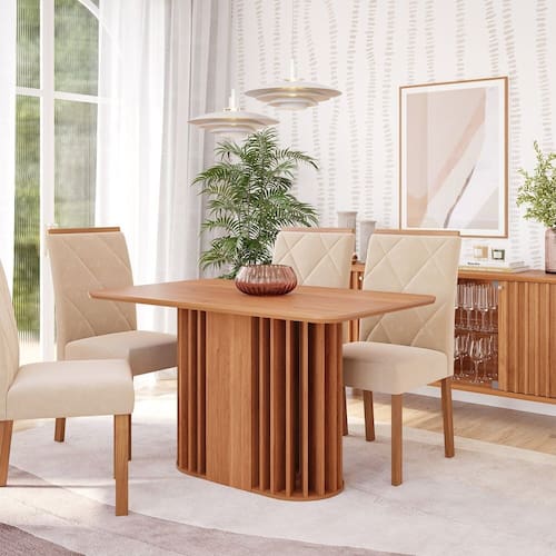 A mesa Julieta se destaca pelo design atemporal e pela elegância nos detalhes. Sua base em MDF com formato oval e acabamento ripado adiciona sofisticação, enquanto a fixação oculta proporciona um visual limpo e moderno. O tampo em MDF com pintura U.V, confere durabilidade e requinte, tornando esta peça ideal para quem busca funcionalidade sem abrir a mão do estilo. A cadeira Fernanda representa a fusão perfeita entre elegância, conforto e praticidade. Sua estrutura é habilmente confeccionada em madeira, conferindo-lhe não apenas uma base sólida e durável, mas também um toque de rusticidade refinada que complementa diversos estilos de decoração. O assento e o encosto da cadeira são revestidos com estofamento de alta qualidade, proporcionando uma experiência de conforto excepcional. Medida da Mesa (A x L x P): 76,2cm x 80cm x 130cm Peso da Mesa: 46,5 kg Mesa suporta até: 40.0000 Acabamento da Cadeira/Banco: Verniz Natural Acabamento da Mesa: Pintura UV Almofada do assento: Fixa Ambiente Principal: Sala de Jantar Cadeira/Banco estofada: Encosto e Assento Estofados Cadeira/Banco Estofada: Encosto e Assento Estofados Cadeira/Banco suporta até: 100.0000 codigo_ean: 7900288044006 Complexidade da Montagem: Média: pode ser montado por mais de uma pessoa e/ou necessite de maior conhecimento para montagem Cor: Cinamomo/Madeira/Nude Cor do Produto: Cinamomo/Madeira/Nude Cor Secundária: Marrom De Canto (Canto Alemão): Não Enchimento do Assento: Espuma D-20 Enchimento do Encosto: Espuma D-18 Escala de Brilho: Semi-Brilho Espessura do Tampo: 25 mm Formato do Tampo: Retangular Itens Inclusos: 1 Mesa + 4 Cadeiras + 1 Manual de Montagem Manual de Montagem e Instalação: https://product-hub-prd.madeiramadeira.com.br/974897/documents/f9f18262-8c55-49dd-abf1-debb74a64fa32638624503517373914492089.pdf Marca: Cimol Material da Base da Mesa: MDF Material da Estrutura da Cadeira: Madeira Material do Tampo: MDF Medida da Cadeira/Banco (A x L x P): 99cm x 46cm x 57cm Medida do Tampo (L x C x E): 80 x 130 x 2,5 Mesa Extensível: Não Necessita Montagem: Sim Origem do Produto: Nacional Peso da Cadeira/Banco: 9 kg Possui Apoio Para os Pés: Não Possui Vidro: Não Quantidade de Cadeiras: 4 Quantidade de Lugares: 04 Recomendações de Uso, Manutenção e Limpeza: Para manter seu móvel novo por muito mais tempo, evite locais úmidos, mantenha-o distante de líquidos. Para limpá-lo com segurança utilize uma flanela seca sem produtos abrasivos Revestimento da Cadeira/Banco: Suede Sistema de Montagem: Parafusos, porcas e cavilhas.