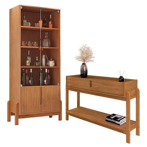 Renove sua sala de jantar com o Conjunto Lizz, que inclui a Cristaleira e o Aparador. A Cristaleira Lizz combina elegância e funcionalidade com portas de MDF usinadas e vidro temperado, além de dobradiças soft-close e prateleiras internas para organização. O Aparador Lizz oferece design moderno com tampo e laterais em MDF, duas gavetas de deslizamento suave, e pés de madeira maciça com um toque retrô. Ambos os móveis têm acabamento em pintura UV para maior durabilidade. Juntos, eles trazem sofisticação e praticidade à sua sala de jantar.