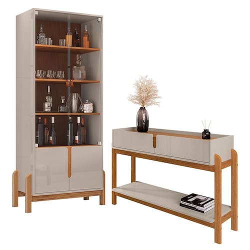 Renove sua sala de jantar com o Conjunto Lizz, que inclui a Cristaleira e o Aparador. A Cristaleira Lizz combina elegância e funcionalidade com portas de MDF usinadas e vidro temperado, além de dobradiças soft-close e prateleiras internas para organização. O Aparador Lizz oferece design moderno com tampo e laterais em MDF, duas gavetas de deslizamento suave, e pés de madeira maciça com um toque retrô. Ambos os móveis têm acabamento em pintura UV para maior durabilidade. Juntos, eles trazem sofisticação e praticidade à sua sala de jantar.