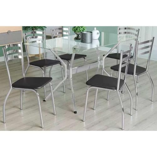 Sala de Jantar Completa Loire c/ Tampo de Vidro 80x140cm e 6 Cadeiras Noruega Cromada - Preto - Kappesberg Abaixo segue os produtos do KIT: Sala de Jantar Completa Loire c/ Tampo de Vidro 80x140cm e 6 Cadeiras Noruega Cromada - Preto - Kappesberg Tampo Mesa Sala de Jantar Vidro TAV1461 Vidro Retangular 140x80cm Incolor - Kappesberg