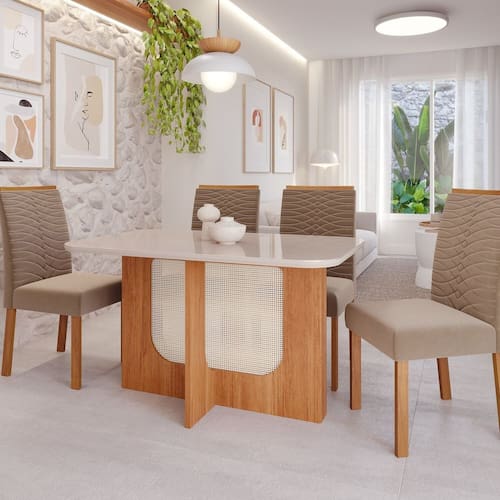 A base da Mesa Louise é uma obra de arte por si só. Feita de MDF, proporciona estabilidade excepcional, enquanto o detalhe em tela sintética adiciona um elemento de textura e elegância. O tampo de vidro temperado confere um toque de modernidade e leveza. Além de ser visualmente impressionante, o vidro temperado oferece robustez e segurança. O assento e o encosto da cadeira são revestidos com estofamento de alta qualidade, proporcionando uma experiência de conforto excepcional. A inovação da cadeira Clarice também se estende ao seu sistema de facil montagem.