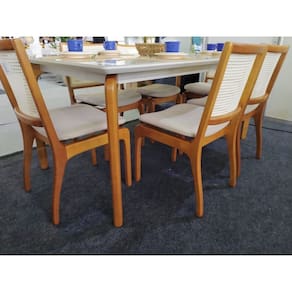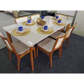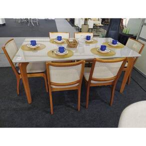Sala de Jantar Madeira Maciça com vidro 6 Cadeiras 1,80x1,0m - Esparta - Requinte Salas Esta sala de jantar traz uma opção a mais para complementar sua decoração. Uma mesa que possui um design contemporâneo, sua base tem um design moderno com um visual clean. A Mesa Esparta é a pedida certa para você deixar sua casa mais moderna. Tem base em madeira maciça Tauari e tampo em MDF laminado. As cadeiras Barcelona possuem um design moderno e um acabamento muito delicado, que vai trazer ao seu ambiente um ar sofisticado e elegante! As cadeiras tem a estrutura em madeira maciça tauari, madeira ecologicamente correta, e o seu encosto com detalhe em telinha de fibra natural. Quanto a durabilidade, esse modelo não deixa nada a desejar, o seu assento é fabricado com espuma de densidade D-26, muito confortável, e as cadeiras suportam ate 150Kg distribuídos. Se você procura uma cadeira elegante e moderna, esse modelo é perfeito!! Aproveite! Não perca tempo e compre logo a sua sala de jantar. Fazem parte do anúncio 1 Mesa de Jantar Esparta 6 Cadeiras Barcelona Obs. Objetos de decoração não inclusos. Particularidades da Sala de Jantar Características da Mesa: - Base em madeira maciça Tauari; - Tampo em MDF laminado; - Tampo retangular; - Madeira ecologicamente correta. Características da Cadeira: - Madeira Maciça Tauari seca em estufa; - Madeira imunizada; - Espuma D-26 no assento; - Encosto com telinha (Rattan) de fibra natural; - Estrutura reforçada; - Ecologicamente correta; - Peso suportado 150kg; Dimensões da Mesa: Altura: 79 centímetros Largura: 1,80 metros Profundidade: 1,0 metro Dimensões da Cadeira: Altura: 86 centímetros Largura: 47 centímetros Profundidade: 54 centímetros Informações Importantes: - Produtos podem apresentar diferenças de tonalidades entre a foto na tela e o produto real, devido a calibração de cor de tela. - Limpar com flanela ou pano macio. Não utilizar álcool. Não utilizar produtos abrasivos ou corrosivos. - Nós prezamos pela qualidade da entrega em primeiro lugar, trabalhamos com transportadoras altamente selecionadas e os melhores materiais de embalagem. - As cadeiras vão montadas nas caixas e embaladas. Necessário fixar o assento e o encosto e parafusar, não necessita da montagem de um profissional. A mesa vai semi montada, necessário fixar o tampo a base. - Objetos de decoração não incluso. - Certifique-se de que o produto caiba em elevadores e vãos de escadas, não fazemos içamentos ou desmontagens de produtos. Quaisquer despesas deste tipo ficam a cargo do cliente. - Garantia de 3 meses contra defeitos de fabricação. Marca: Requinte Salas