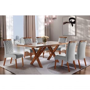 A mesa de jantar Nobre tem um design individualizado, que une modernidade, beleza e sofisticação, produzida com os materiais da mais alta qualidade para atender bem os seus usuários. Ela tem a estrutura da base em madeira maciça Tauari, ecologicamente correta, o tampo em MDF 45mm de espessura, vidro de 3mm sobreposto, e quinas canto tick que traz uma modernidade a mais. Um escândalo de elegância junto das cadeiras Alfa! As cadeiras Alfa esbanjam elegância e charme para deixar sua sala de jantar completa e moderna! Elas contam com um encosto todo estofado com detalhes em costura, e um pegador em madeira maciça, que proporcionam um charme a mais a esse modelo. O assento é fabricado com espuma de densidade D-23 e D-20 no encosto, reforçando o conforto do produto. Sua estrutura é toda em madeira maciça tauari, ecologicamente correta. Perfeitas, não é mesmo? Aproveite!